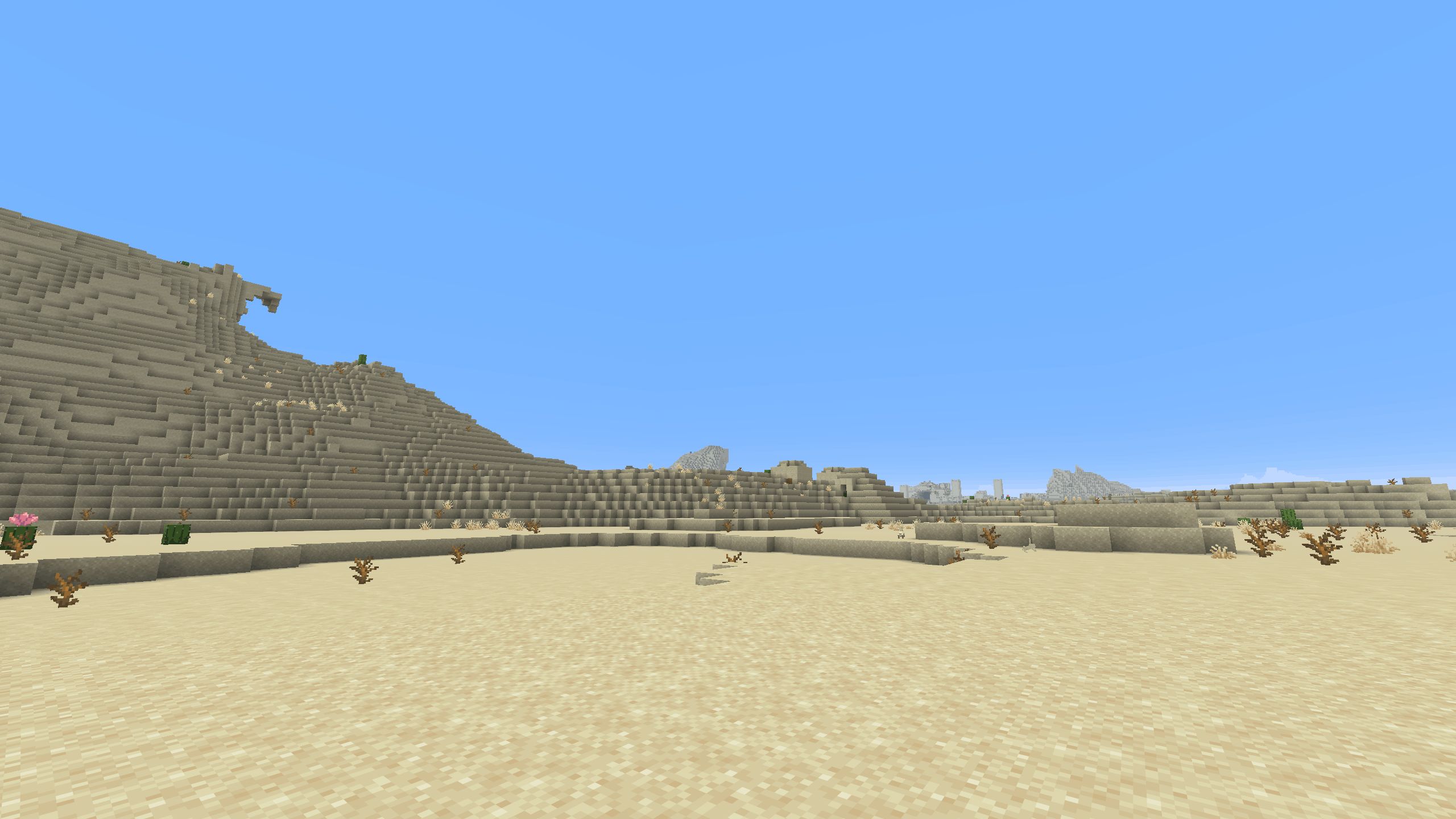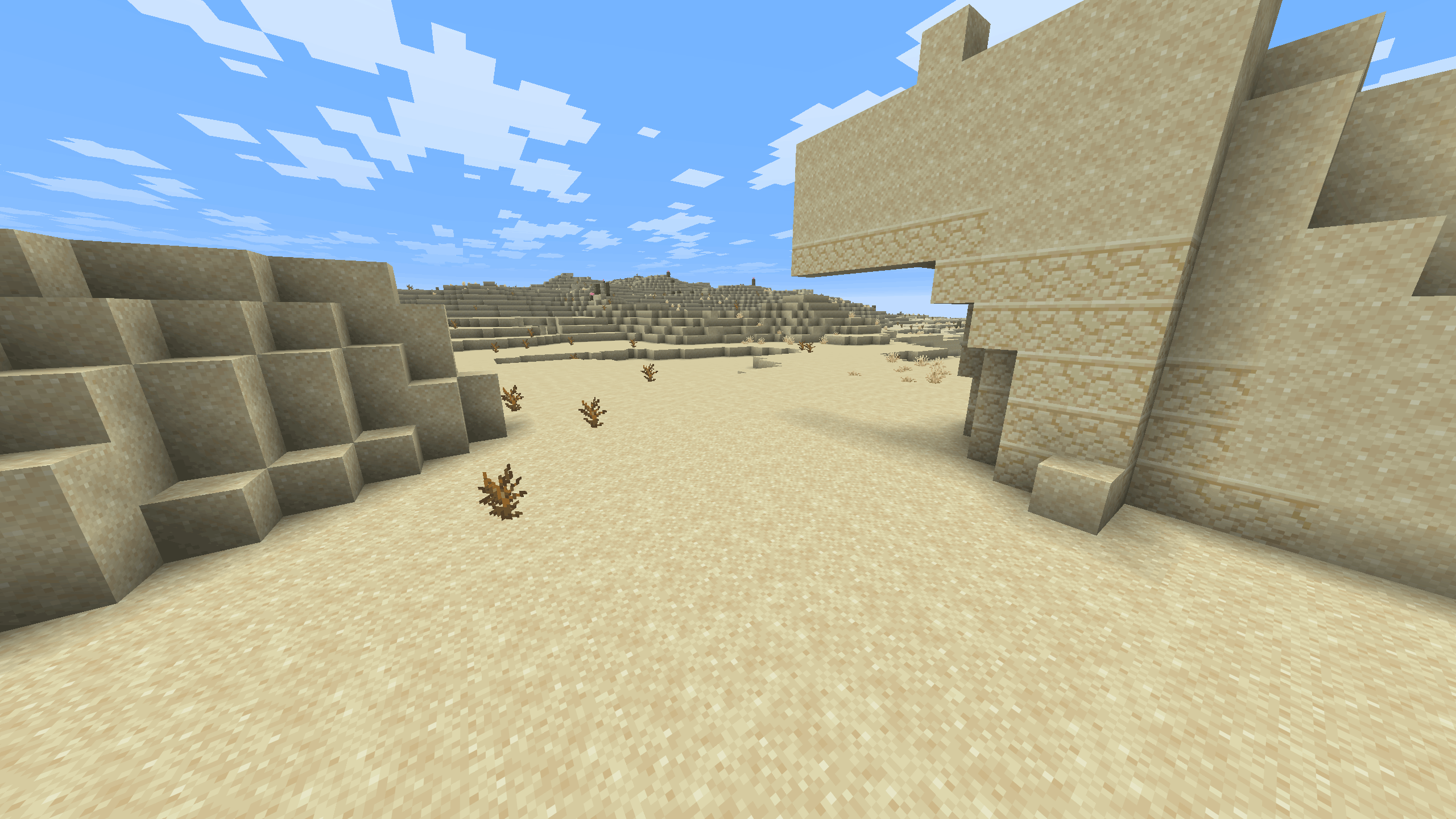 The terrain in the Desert biome is mostly flat, with small dunes, shallow valleys, and occasional plateaus. The surface is made almost entirely of sand, with sandstone layers underneath.